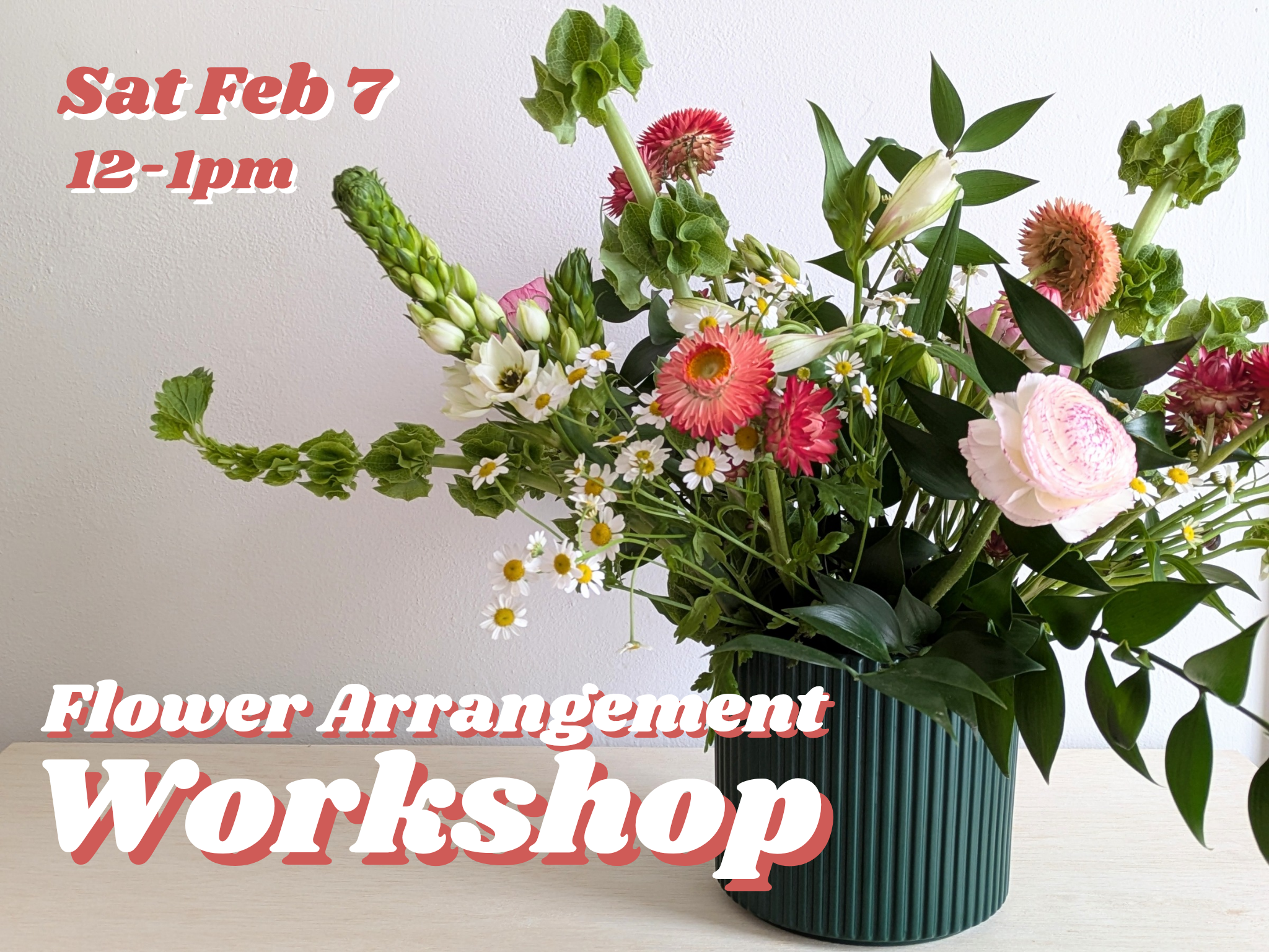 Make your own arrangement from a wide variety of fresh florals in this hour long instructed workshop. Florals will include your staples of alstroemerias to more unique ones like strawflower and ranunculus. You'll be bringing home your own large arrangement at the end of class.
